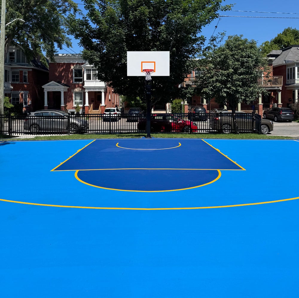 In addition to the above, the community was rallying around glass backboards for the systems, but given the fact that the new units would be closely situated to a pool, they instead opted for our beautifully-designed steel backboards.