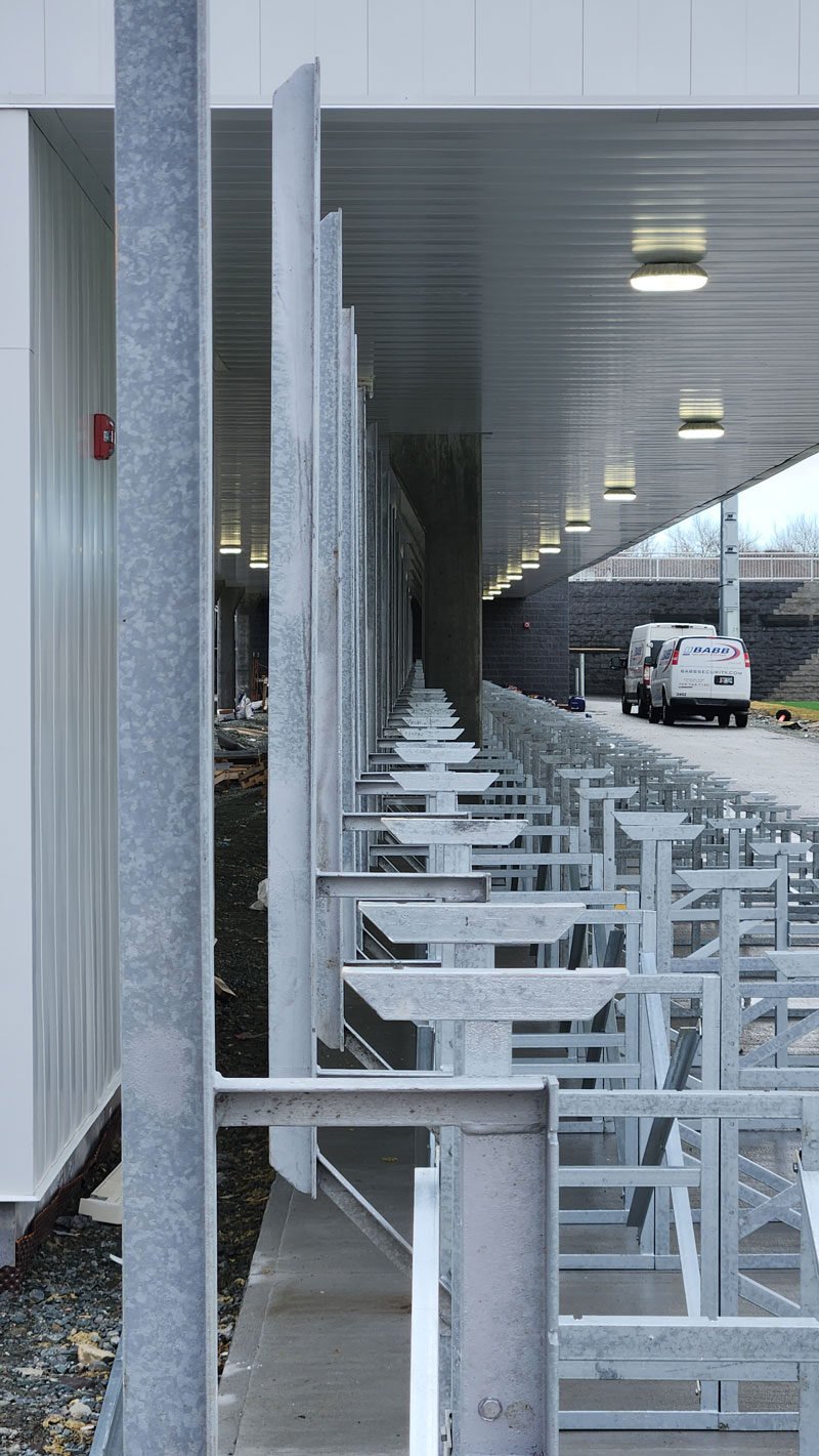 This particular custom bleacher was designed to fit under a building that was under construction on the site. As part of the project, we had to factor in the concrete columns that could interfere with our bleachers along with the overhead clearance.